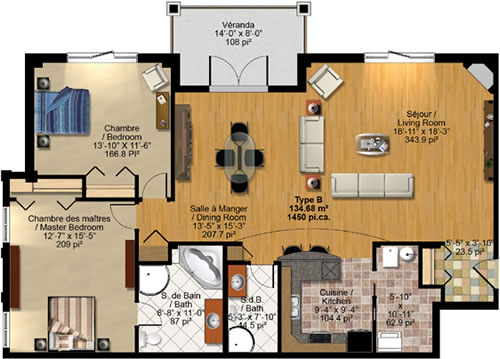 Superficie de 1,450 pi.2 comprenant 2 chambres à coucher